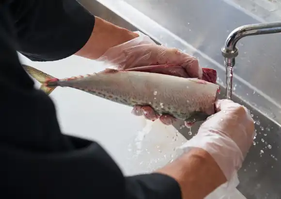 手間を惜しまないことで、獲れたて直後と変わらない最高の鮮度を保った鯖の提供を可能としております。